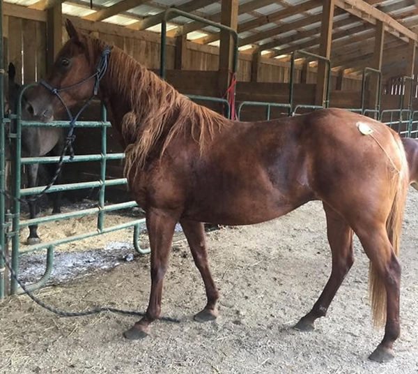 Lakota is a sorrel (reddish-brown) Quarter Horse mare who was saved in June 2019 when she was 8 years old. She is broke to ride. Lakota is very flashy. When she was saved, she had her filly mule, Apache, by her side.